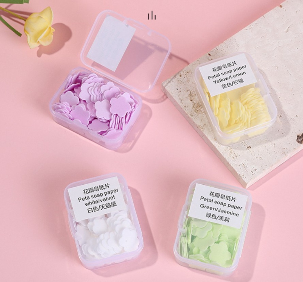 Bu pratik ve şık cep boy yaprak sabun kağıtları ile hijyen her zaman elinizin altında. Her biri zarif bir çiçek yaprağı şeklinde tasarlanmış bu sabun kağıtları, suyla temas ettiğinde hızla köpürerek ellerinizi etkili bir şekilde temizler ve hoş bir koku bırakır.