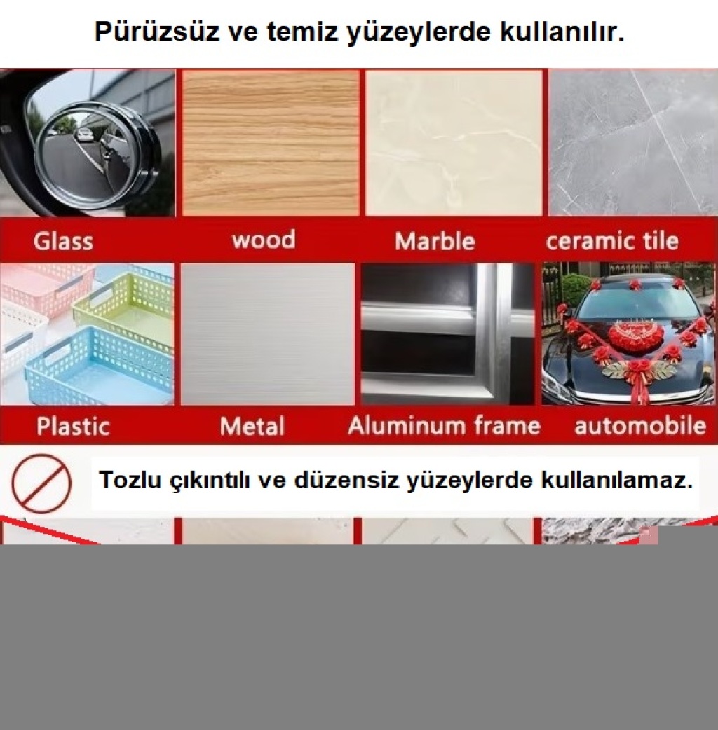 ⚠️ ÖNEMLİ - Uygun Yüzeyler:Maksimum verim almak için bandı Cam, Ahşap, Mermer, Fayans/Seramik, Plastik, Metal ve Alüminyum gibi PÜRÜZSÜZ ve DÜZ yüzeylerde kullanınız.