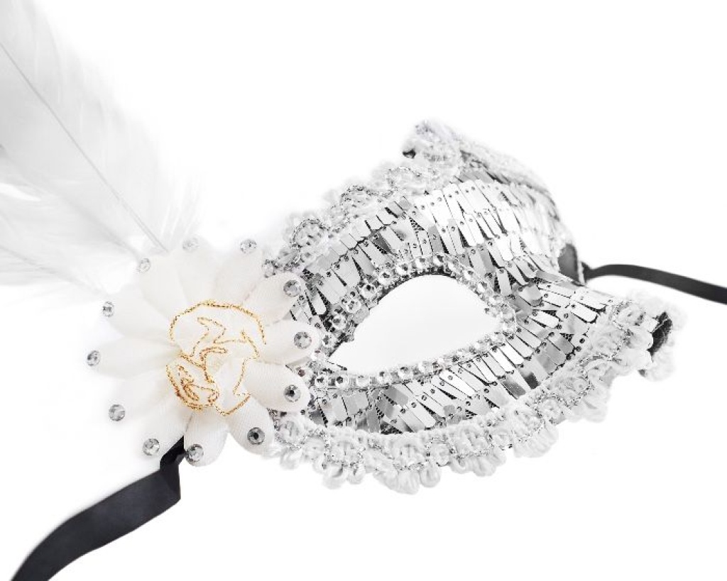 Gümüşün ışıltısı ve beyazın saflığı ile göz kamaştırmak ister misiniz? O halde size 18x22 cm boyutundaki gümüş payetli pullu beyaz renk yandan tüylü parti maskemizi sunuyoruz!
