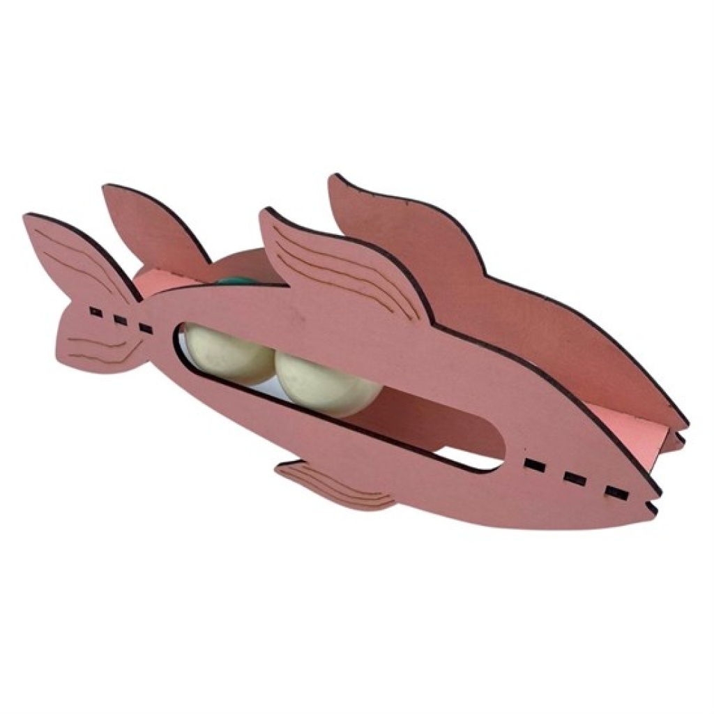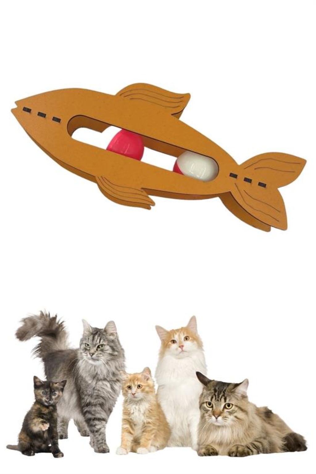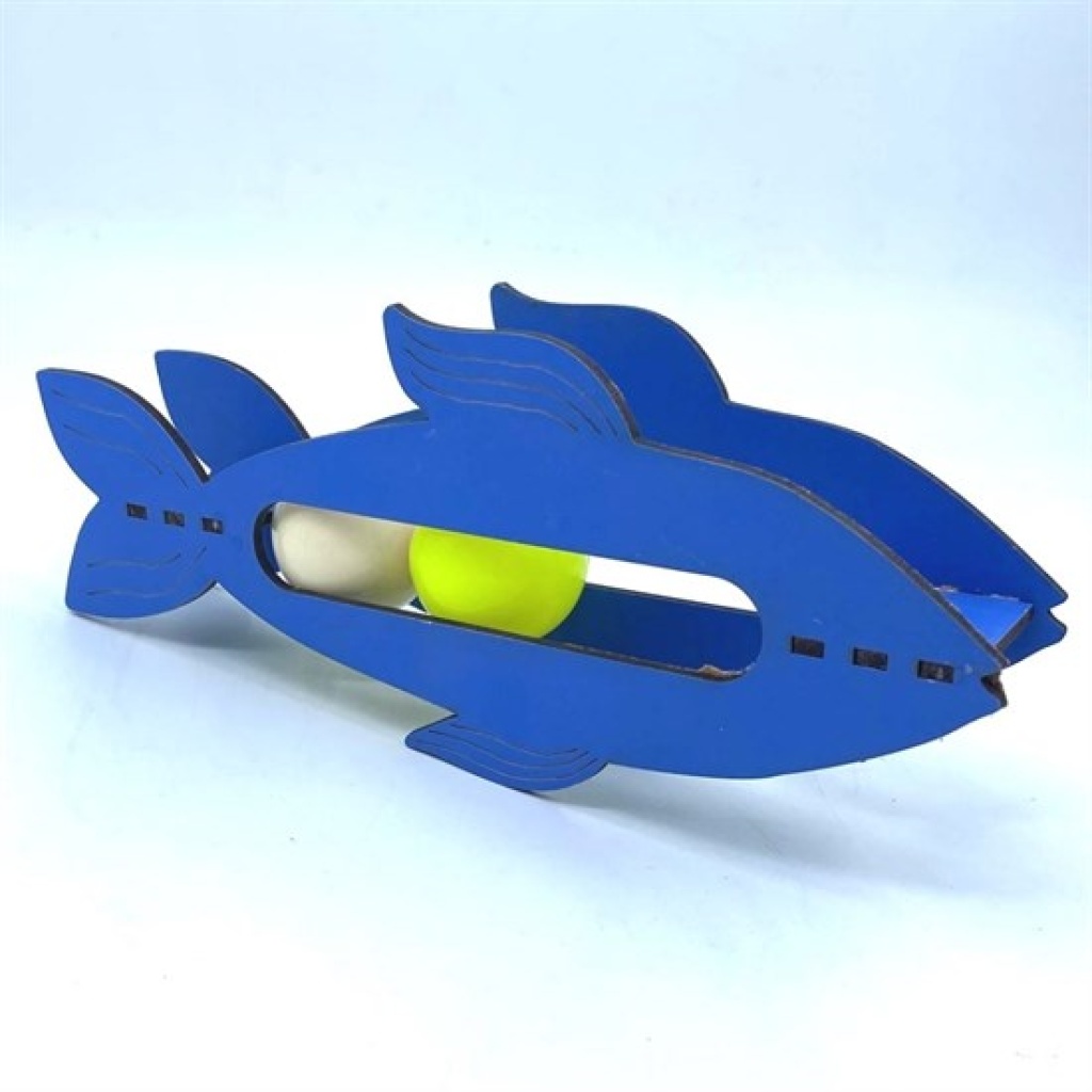 Bu ahşap balık oyuncağının içinde yuvarlanan iki topun sesi kedileri meraklandırır ve dikkatlerini toplar.