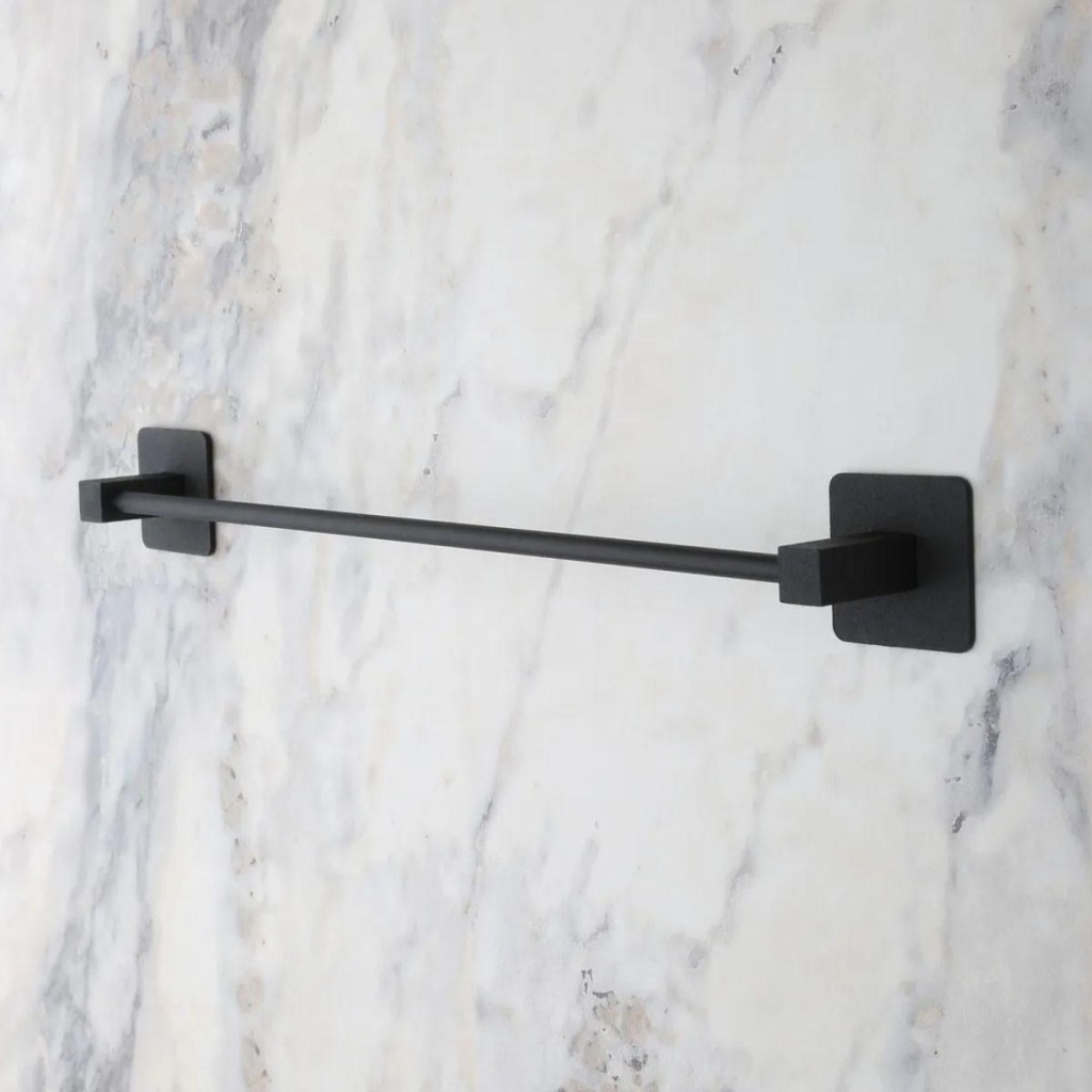 Kendiliğinden yapışkanlı siyah çubuk havluluk, şık ve pratik bir şekilde havlularınızı saklamanızı sağlar. Modern tasarımıyla dekorunuza uyum sağlar ve kullanıcılarına kolaylık sunar. Su ve nemden etkilenmeyen dayanıklı malzemesiyle uzun ömürlü bir kullanım vadediyor.