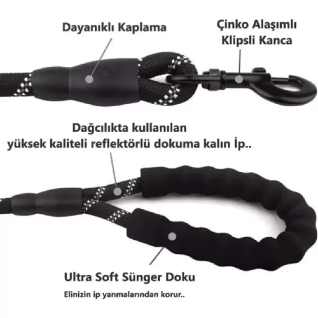 Köpekler İçin Reflektörlü Halat Gezdirme Tasması (130 cm - Siyah)Ürün AçıklamasıOrta ve büyük boy köpeklerinizle yapacağınız yürüyüşlerde maksimum kontrol ve konforu bir arada yaşayın! Reflektörlü Halat Gezdirme Tasması, dağcılık ekipmanlarında kullanılan ultra dayanıklı tırmanma ipinden ilham alınarak tasarlanmıştır. Güçlü çekişlere karşı dirençli yapısı, gece fark edilebilirliği artıran reflektörlü şeritleri ve elinizi koruyan yumuşak sünger sapı ile hem sizin hem de sadık dostunuzun güvenliği için en ideal seçimdir.Ürün ÖzellikleriDağcılık Kalitesinde Halat: 1/2 inç çapında, kaya tırmanışlarında kullanılan yüksek kaliteli dokuma ipten üretilmiştir. En güçlü çekmelere ve ani hareketlere karşı üstün dayanıklılık sağlar.Gece Görüşü İçin Reflektörlü Şeritler: Halat boyunca dokunmuş son derece yansıtıcı (reflektörlü) iplikler, akşam ve gece yürüyüşlerinde araçlar tarafından kolayca fark edilmenizi sağlayarak güvenliğinizi artırır.Ultra Soft Sünger Sap: Tutma yerindeki özel yumuşak yastıklı doku, köpeğiniz aniden hareket ettiğinde oluşabilecek ip yanmalarından elinizi korur ve uzun süreli yürüyüşlerde bile konforlu bir kavrama sunar.Çinko Alaşımlı Güçlü Kanca: 360 derece dönebilen çinko alaşımlı klipsli kanca, paslanmaya karşı dayanıklıdır ve tasmanın birbirine dolanmasını engelleyerek özgürce hareket imkanı verir.Orta ve Büyük Irklar İçin İdeal: Güçlü gövde yapısı sayesinde orta ve büyük boy köpeklerin enerjisini kontrol altında tutmak için özel olarak boyutlandırılmıştır.Kullanım AvantajlarıMaksimum Güvenlik: Hem gündüz hem gece güvenliği tek bir tasmada birleştirir.El Dostu Tasarım: Halat yanmalarını ve avuç içi tahrişlerini önleyen yastıklı sap teknolojisi.Şık ve Modern Görünüm: Siyah rengin asaleti ve profesyonel dağcı ipi tasarımıyla estetik bir görünüm sağlar.Teknik BilgilerUzunluk: 130 cmHalat Çapı: Yaklaşık 1.2 cm (1/2 inç)Renk: Siyah (Yansıtıcı Gri Şeritli)Uygunluk: Orta ve Büyük Boy KöpeklerMalzeme: Naylon Dağcı İpi + Çinko Alaşım + Yumuşak Sünger SapPaket İçeriği1 Adet Köpekler İçin Reflektörlü Halat Gezdirme Tasması (130 cm - Siyah)