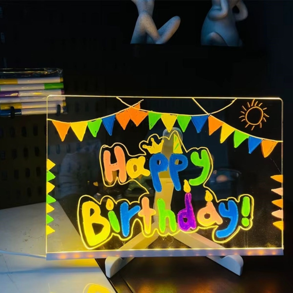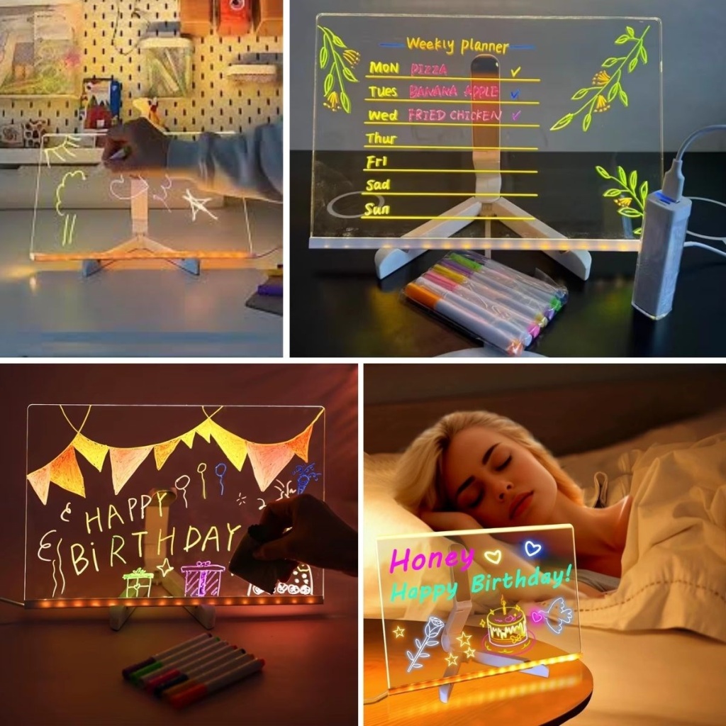 Işıltılı notlar, yaratıcı mesajlar ve eğlenceli çizimler için ideal! LED Işıklı Yazı Panosu, 20x30 cm’lik dikdörtgen formu ve renkli fosforlu kalemiyle ev, ofis ve çocuk odaları için hem pratik hem dekoratif bir çözüm sunar. LED ışık desteğiyle yazılarınız gece bile canlı ve dikkat çekici olur.