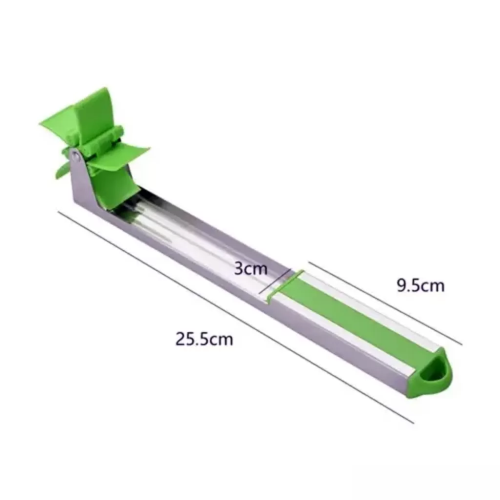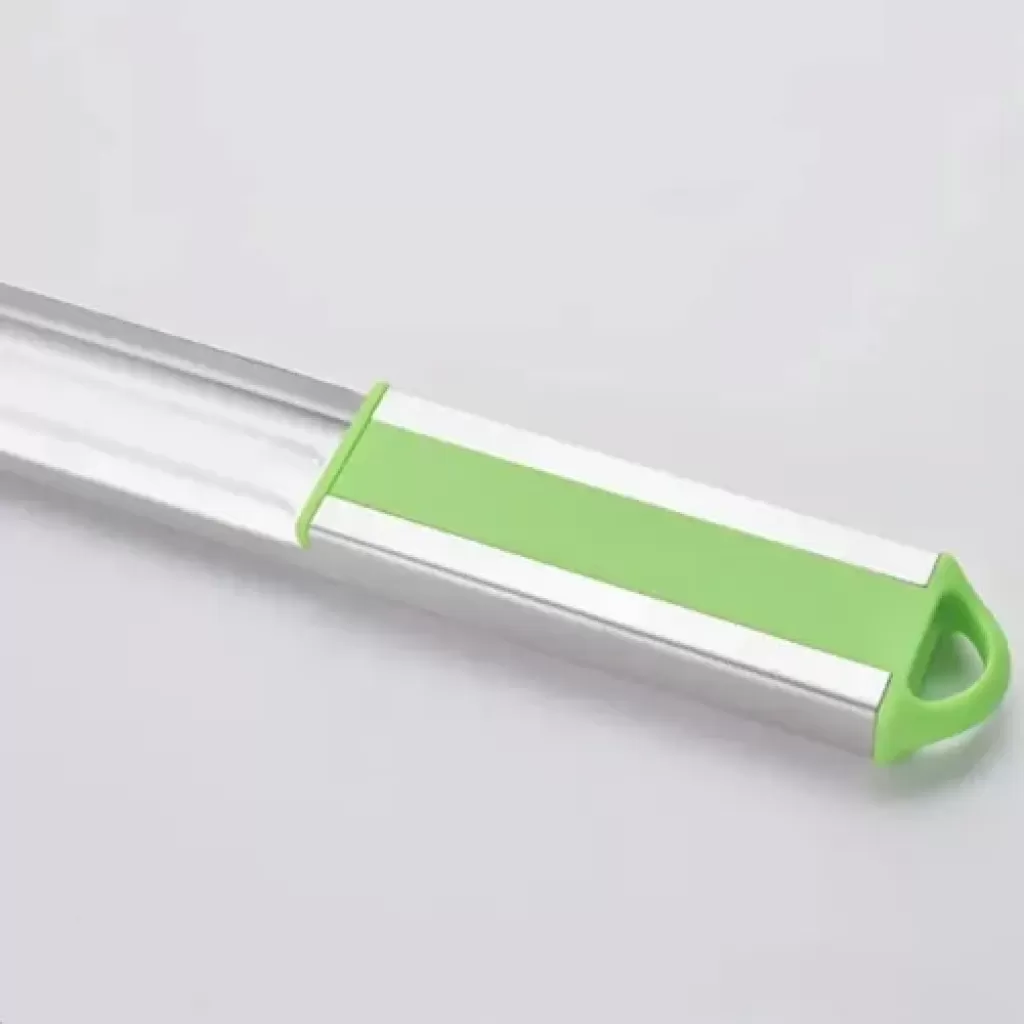 Pratik Paslanmaz Çelik Karpuz Dilimleyici – Mükemmel Küp DilimlerÜrün AçıklamasıYaz aylarının vazgeçilmezi karpuzu dilimlemek hiç bu kadar kolay, hızlı ve eğlenceli olmamıştı! Pratik Karpuz Dilimleyici, karpuzu klasik yöntemlerle keserken oluşan dağınıklığı ve zaman kaybını ortadan kaldırır. Saniyeler içinde eşit ve nizami dilimler elde etmenizi sağlayan bu yenilikçi mutfak gereci, özel tasarımı sayesinde karpuzun en sulu kısımlarını kabuğuna zarar vermeden kolayca çıkarmanıza yardımcı olur.Ürün ÖzellikleriHızlı ve Nizami Kesim: Karpuzun yüzeyinde ileri-geri hareket ettirerek profesyonel şeflerin elinden çıkmış gibi kusursuz küpler elde edebilirsiniz.Paslanmaz Çelik Gövde: Gıda ile temasa uygun, yüksek kaliteli paslanmaz çelikten üretilmiştir. Paslanmaya karşı dayanıklıdır ve uzun ömürlü kullanım sunar.Çocuk Dostu Güvenli Tasarım: Keskin bıçak kenarları yerine itme gücüyle çalışan mekanizması sayesinde ellerinizi yaralama riski taşımaz. Çocukların bile güvenle kullanabileceği bir yapıdadır.Ergonomik ve Hafif: Ele tam oturan sapı ve hafif gövdesi sayesinde yorulmadan tüm bir karpuzu dakikalar içinde servis edilebilir hale getirir.Ayarlanabilir Dilim Boyutu: İhtiyacınıza göre dilimlerin büyüklüğünü ayarlayarak istediğiniz porsiyonları kolayca hazırlayabilirsiniz.Nasıl Kullanılır?Karpuzu ikiye bölün.Dilimleyicinin kesici kısmını karpuzun etli yüzeyine, dilediğiniz büyüklüğü ayarlayarak yerleştirin.Dilimleyiciyi karpuz üzerinde yavaşça ileriye doğru sürün.Cihaz karpuzun kabuğuna ulaştığında yukarı kaldırın; hazır dilimlerin otomatik olarak ayrıldığını göreceksiniz.Kullanım AlanlarıEv ve Mutfak: Misafirleriniz için hızlı ve şık meyve tabakları hazırlamak.Piknik ve Bahçe Partileri: Pratik taşınabilir yapısıyla outdoor etkinliklerde hızlı servis.Restoran ve Kafeler: Meyve salataları ve sunumlar için standart boyutlarda dilimleme.Teknik BilgilerMalzeme: Paslanmaz Çelik & Dayanıklı Sert PlastikBoyutlar: 40 cm x 3,5 cm x 7 cmRenk: Metalik Gümüş / YeşilPaket İçeriği1 Adet Pratik Paslanmaz Çelik Karpuz Dilimleyici
