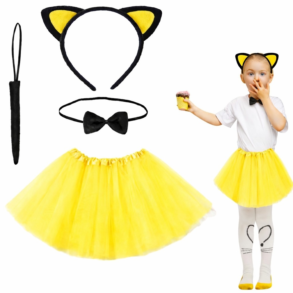 Canlı sarı renk tütü etek, yumuşak dokulu kedi kulak tacı, papyon ve kedi kuyruğu ile tam bir kombin oluşturur.